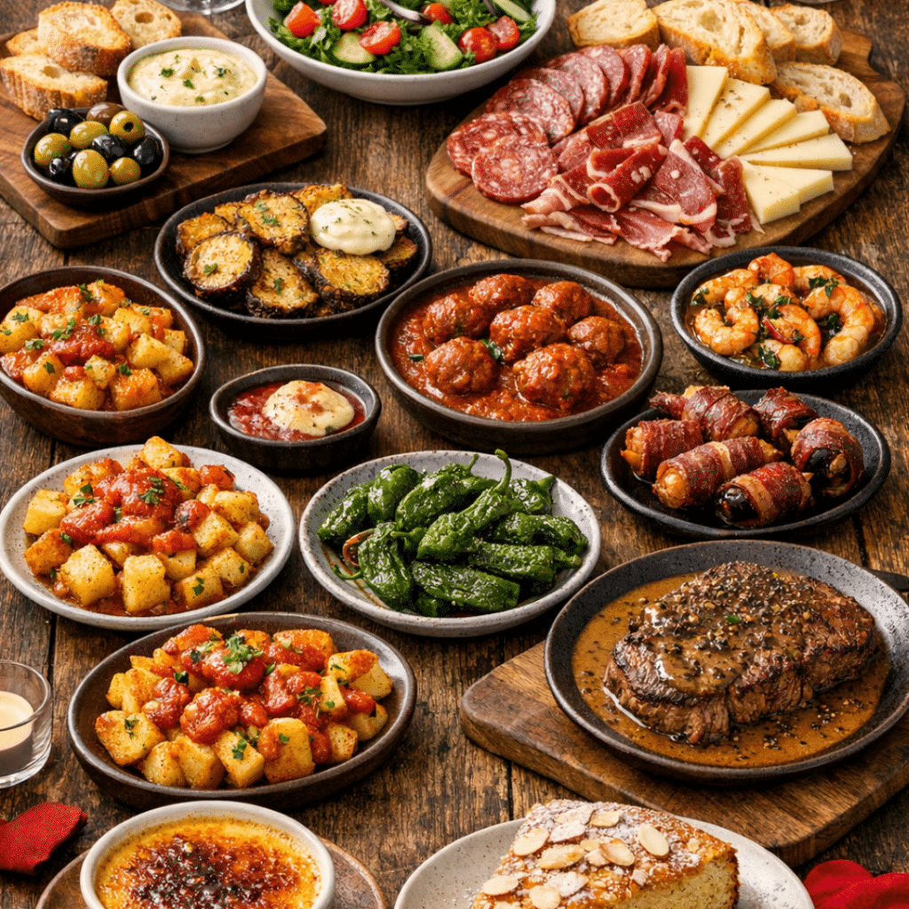 Zum Auftakt Brot mit hausgemachter Aioli, Oliven, saisonaler Salat und eine gemischte iberische Platte. Es folgen zwei abwechslungsreiche Tapas-Gänge mit klassischen spanischen Spezialitäten wie u.a. Patatas, Albóndigas, Gambas al ajillo, Pimientos de Padrón, Champignons und argentinischem Rinderhüftsteak. Den Abschluss bilden Crema catalana und hausgemachter Mandelkuchen.