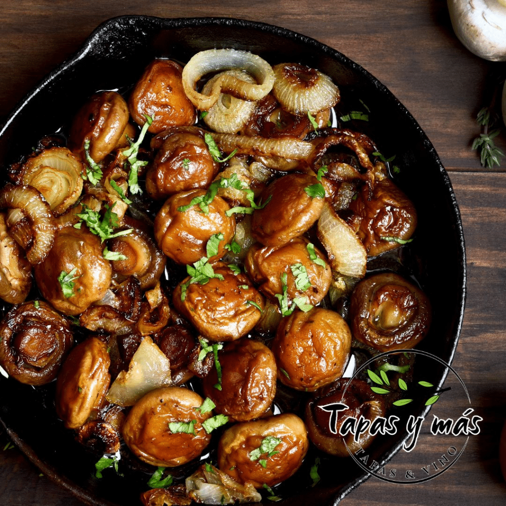 - Champiñones al jerez – geschmorte Champignons mit Zwiebeln, abgelöscht mit Sherry